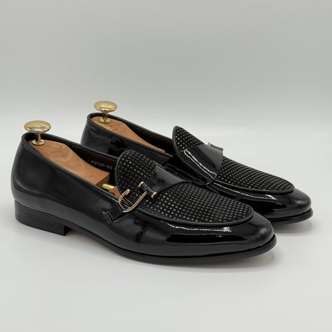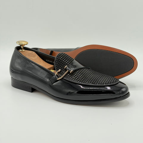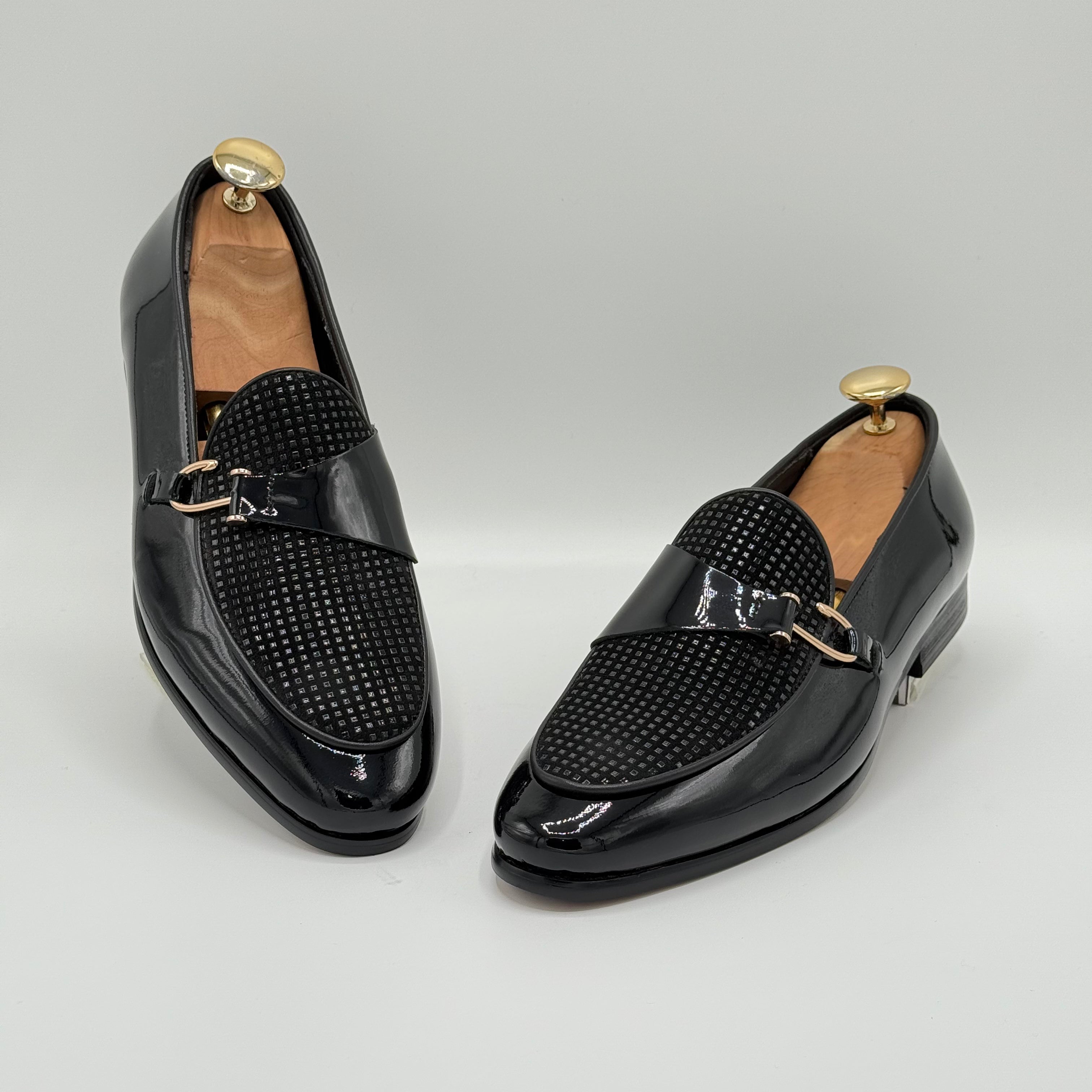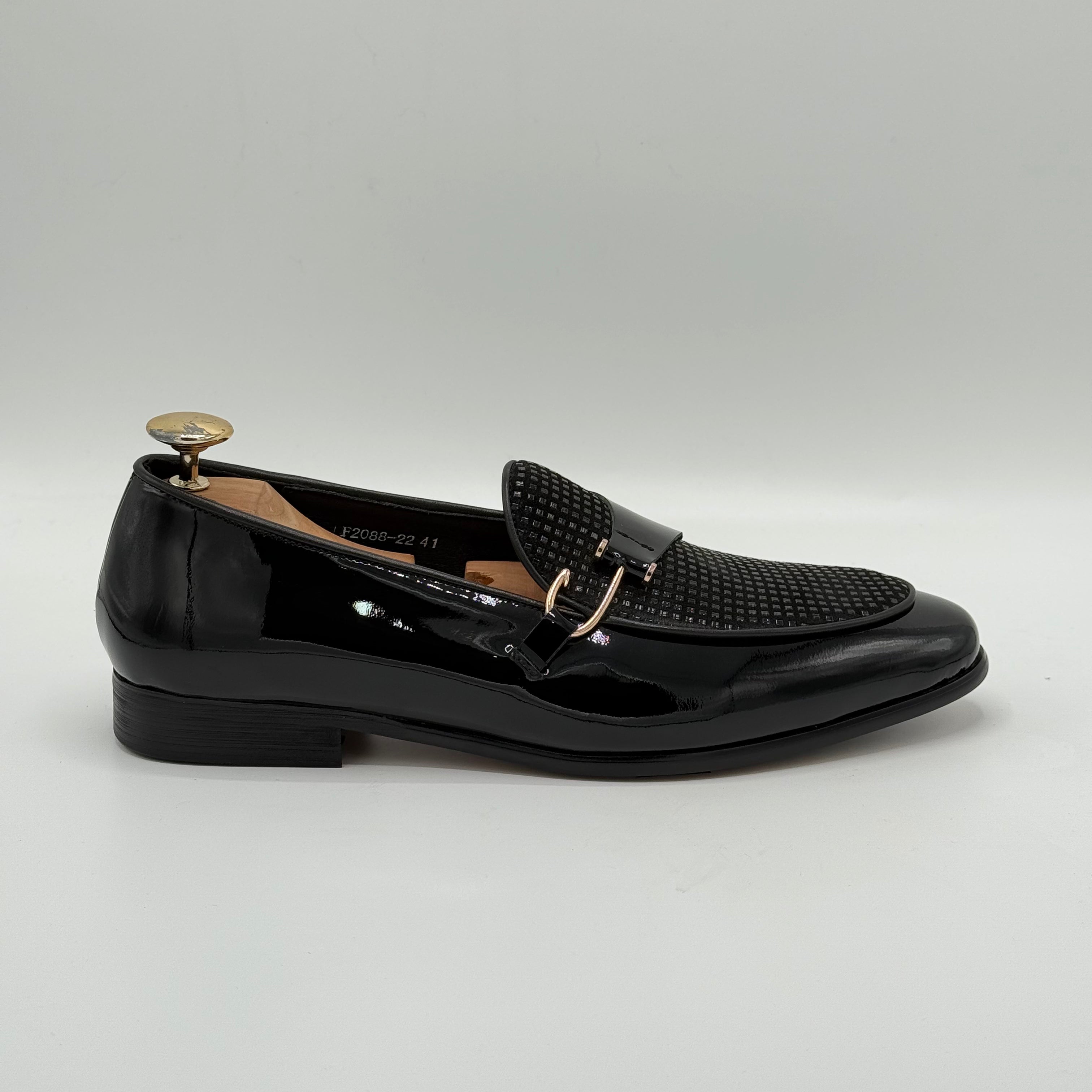 The QUWI shoe stands out with its distinctive design, featuring patent leather on the lower section that adds a sleek, polished finish. The beautifully printed leather on the vamp enhances the overall aesthetic, creating a unique and sophisticated look that complements any outfit with expert craftsmanship.